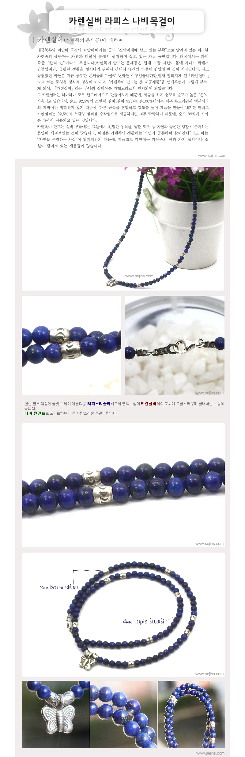 블루컬러의 라피스와 카렌실버가 만나 고급스러움이 더욱 깊어진 느낌이 든답니다.오직 세진에서만 만나볼 수 있는 하나뿐인 특별한 목걸이입니다.