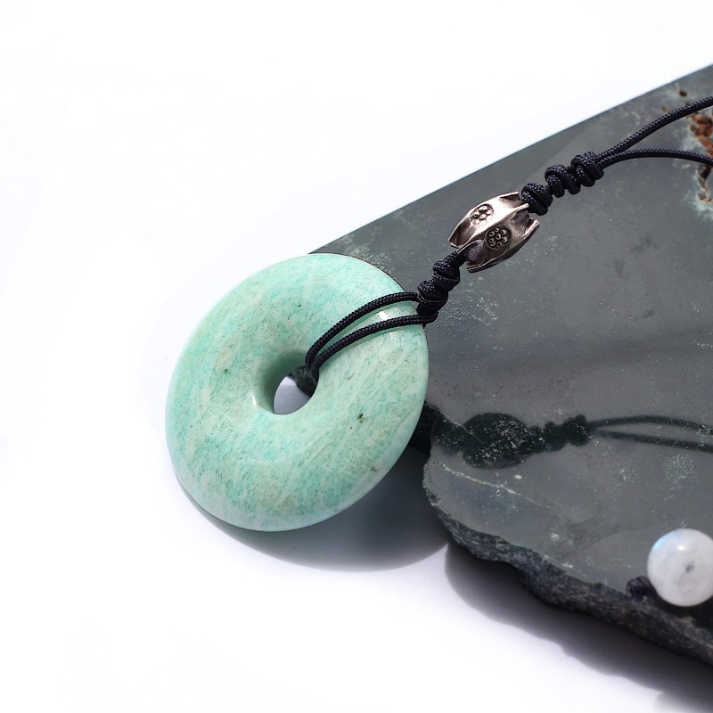 아마조나이트 도넛원석을 엮어만든 매듭목걸이 입니다.