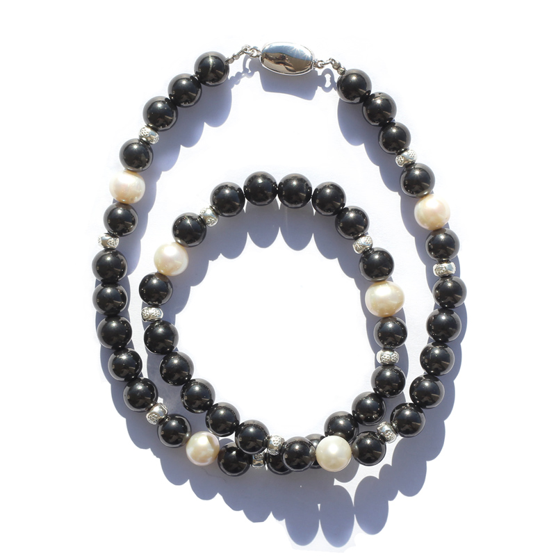 슌가이트와 진주가 같이 엮어진 디자인으로 고급스러움이 느껴지는 목걸이입니다.