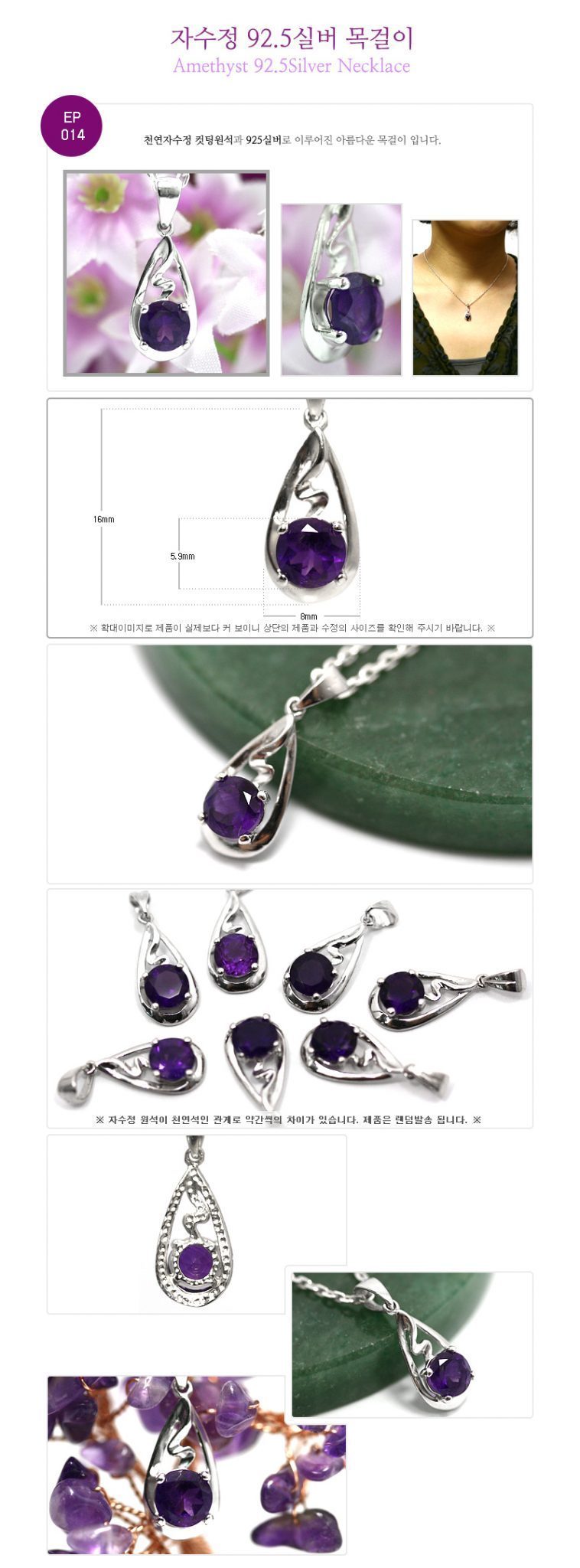 컷팅된 천연 자수정 원석이 925 실버 테두리와 어우러진 멋스러운 목걸이 입니다.자수정 원석이 천연원석인 관계로 저마다 투명도와 중량에 차이가 있습니다.기재된 치수는 평균적인 수치로 생각해주시고요자수정 원석의 차이는 단체컷에서 확인하실 수 있습니다.착오 없으시도록 꼼꼼하게 체크해 주시고 주문해주세요~