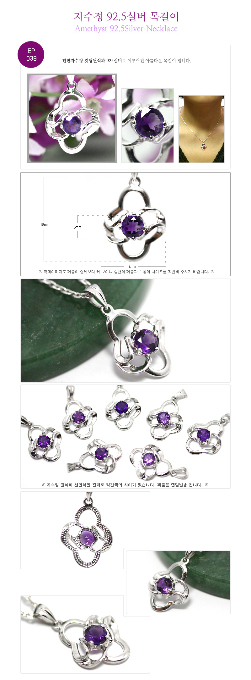 컷팅된 천연 자수정 원석이 925 실버 테두리와 어우러진 멋스러운 목걸이 입니다.자수정 원석이 천연원석인 관계로 저마다 투명도와 중량에 차이가 있습니다.기재된 치수는 평균적인 수치로 생각해주시고요자수정 원석의 차이는 단체컷에서 확인하실 수 있습니다.착오 없으시도록 꼼꼼하게 체크해 주시고 주문해주세요~