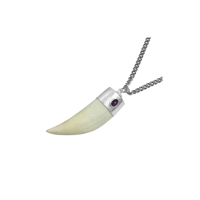 바다사자 이빨 화석에 자수정 달린 마감으로 팬던트 제작한 목걸이입니다. 티타늄 재질의 체인과 연결했습니다.