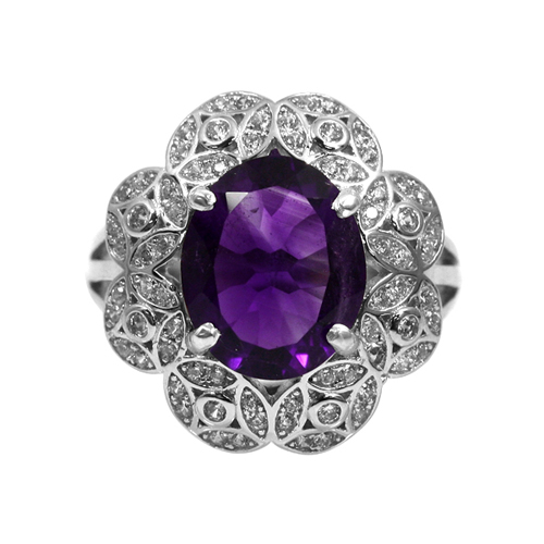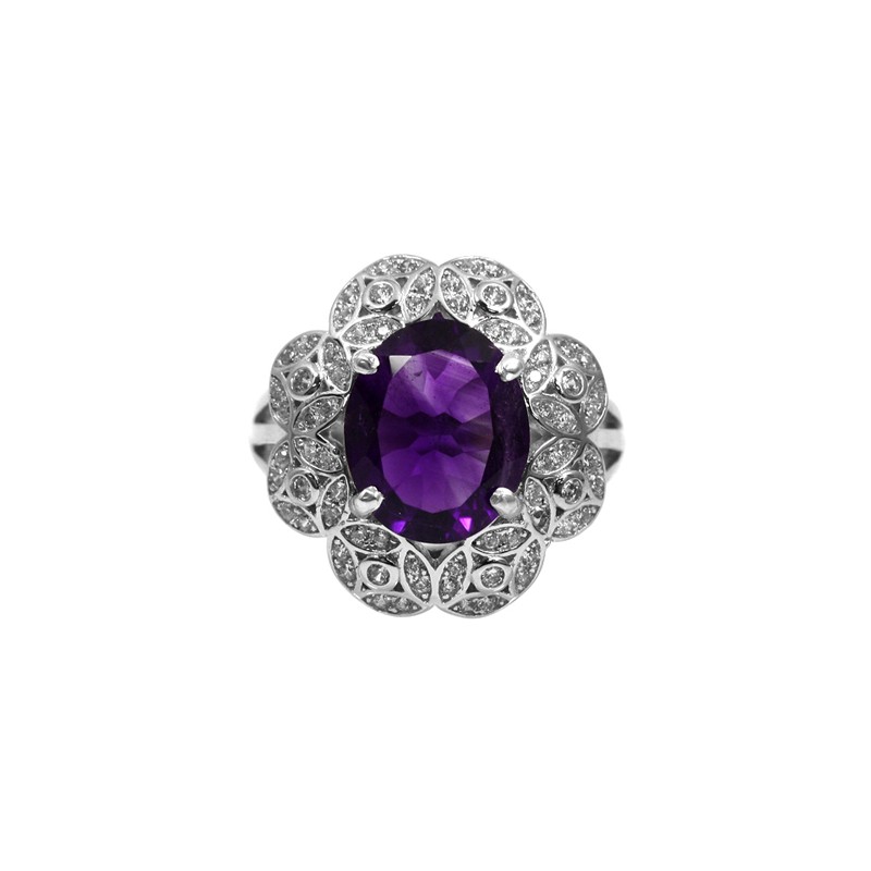 오발 컷팅된 자수정 원석에 화려한 실버 테두리를 두른 아름다운 반지입니다.