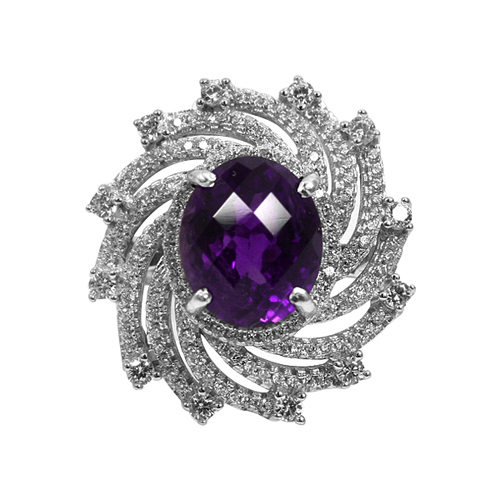 오발체크 컷팅된 자수정 원석에 화려한 실버 테두리를 두른 아름다운 반지입니다.