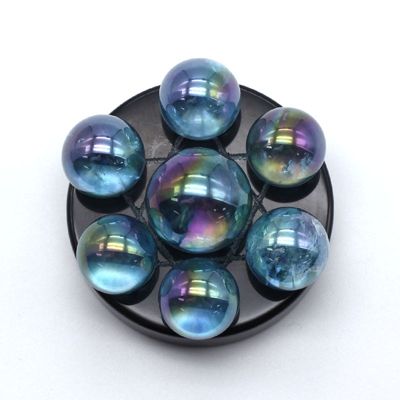 흑요석 칠성판에 오로라 컬러로 빛나는 아쿠아오로라수정 볼의 조화가 아름답습니다.