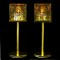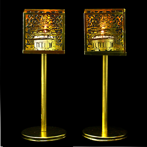 사리장엄 촛대 셋트입니다. 낮은 양초에 불을 붙여 받침대에 올린 후, 사리장엄의 모습이 담긴 갓을 씌우면 뚫린 공간 사이로 빛이 새어나오면서 멋진 분위기를 만들어냅니다.