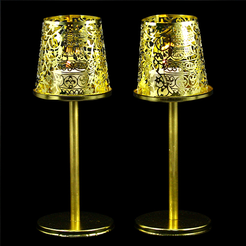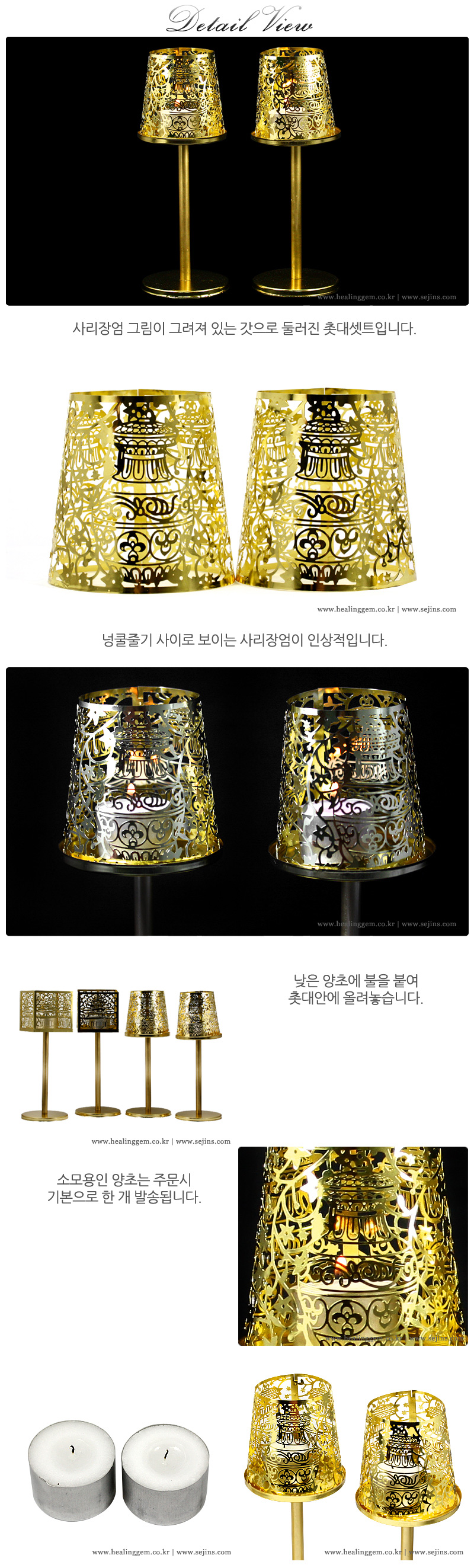 +사리장엄 촛대 셋트입니다. 낮은 양초에 불을 붙여 받침대에 올린 후, 사리장엄의 모습이 담긴 갓을 씌우면 뚫린 공간 사이로 빛이 새어나오면서 멋진 분위기를 만들어냅니다.