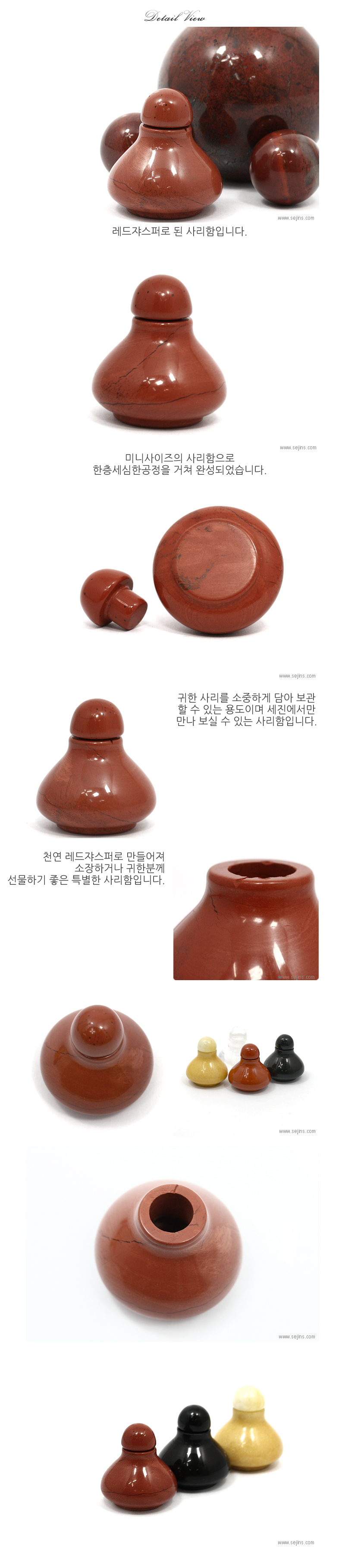 레드 쟈스퍼(Red jasper)란? 치밀질의 덩어리를 이룬 다. 굳기는 석영보다 약간 낮고 비중은 2.6∼2.9로 불순물이 많을수록 무겁다. FeO를 함유한 것은 녹색, Fe2O3을 함유한 것은 적색, Fe2O3 ·nH2O를 함유한 것은 갈색 또는 황색을 띠며, 모두 거의 불투명하 다.
